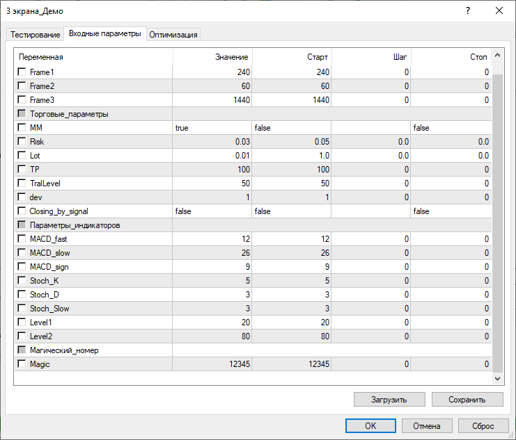 Робот основан на базовой версии трех экранов. В настройках можно адаптировать его под другие таймфреймы, но при таком сценарии придется самостоятельно подбирать параметры индикаторов.