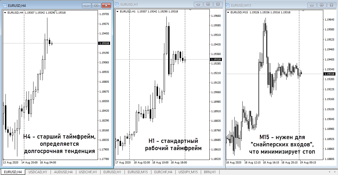 Что касается подбора рабочих «экранов» или таймфреймов, то действует стандартное правило:
