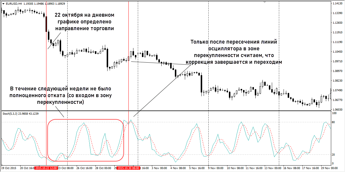На Н4 нужно получить пересечение линий Стохастика в зоне перекупленности. Только через неделю после идентификации тренда на дневном графике получаем завершение коррекции по Стохастику. После закрытия свечи, на которой пересеклись линии Стохастика, переходим на часовой график.
