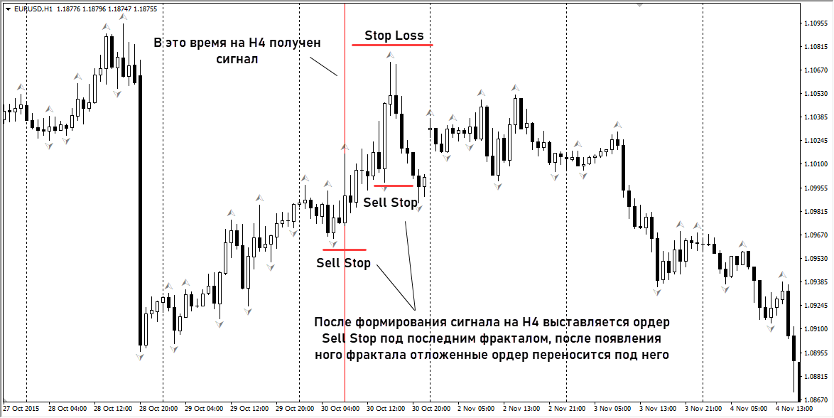 - выставлять отложенные стоп ордера за максимумом или минимумом каждой свечи. В нашем примере отложенные ордера на продажу должны выставляться за Low часовой свечи только когда трейдер получит сигнал о завершении отката на старшем временном интервале. Если коррекционное движение продолжается, то Sell Stop переносится под Low каждой новой свечи до тех пор, пока не будет активирован либо не будет отменен сценарий работы в Sell;