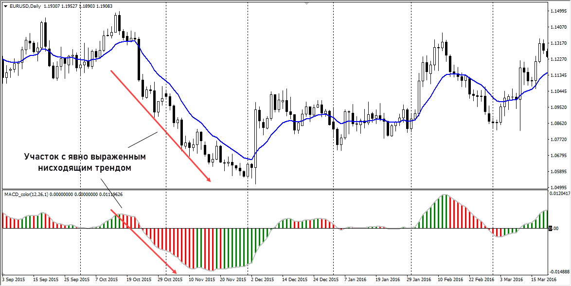 На дневном графике состояние рынка определяется с помощью стандартного MACD (12, 26, 1) и экспоненциальной скользящей средней с периодом 13. Направление движения определяется по сочетанию сигналов от обоих индикаторов: