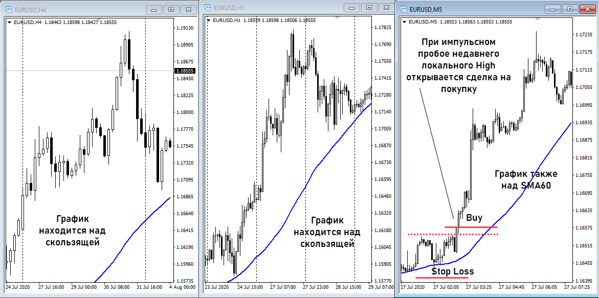 Работа ведется на таймфреймах Н4, Н1 и М5. На всех временных интервалах используется простая скользящая средняя с периодом 60.