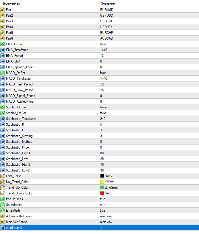 - настройки использующихся стандартных индикаторов (EMA, MACD и Stochastic);