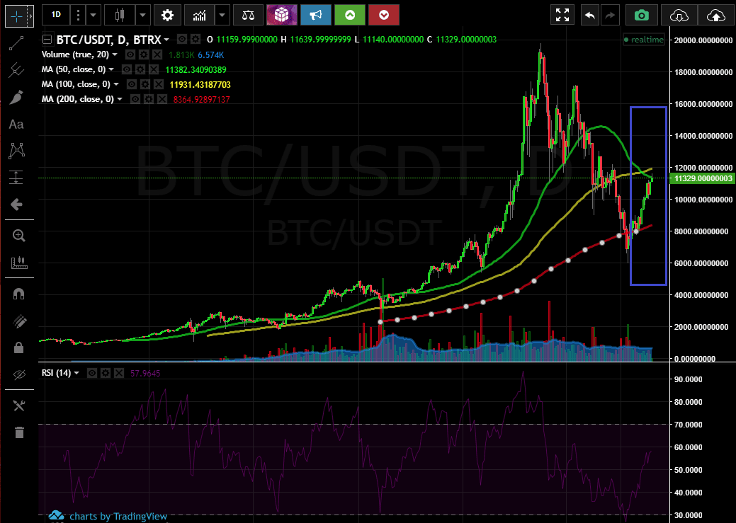 Как видите, все 3 варианта дают добро к покупке, и единственное их отличие — это степень уверенности в покупке. На скриншоте я выделил это место прямоугольником синего цвета. График цены пересекает МА 50,100,200 в рамках сильной коррекции на уровне чуть ниже $8000, после этого цена приближается к $6000, и показывает рост более чем в 35%.