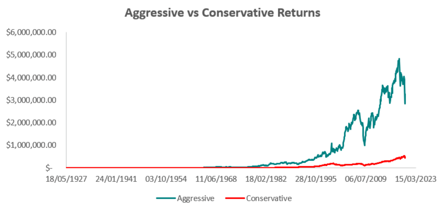 Видно, что за 90+ лет агрессивная стратегия дала в разы больший профит. Также сравнение графиков указывает на нестабильность агрессивного подхода, видны серьезные провалы и резкие взлеты. Инвестпортфель неоднократно уходил в глубокую просадку.