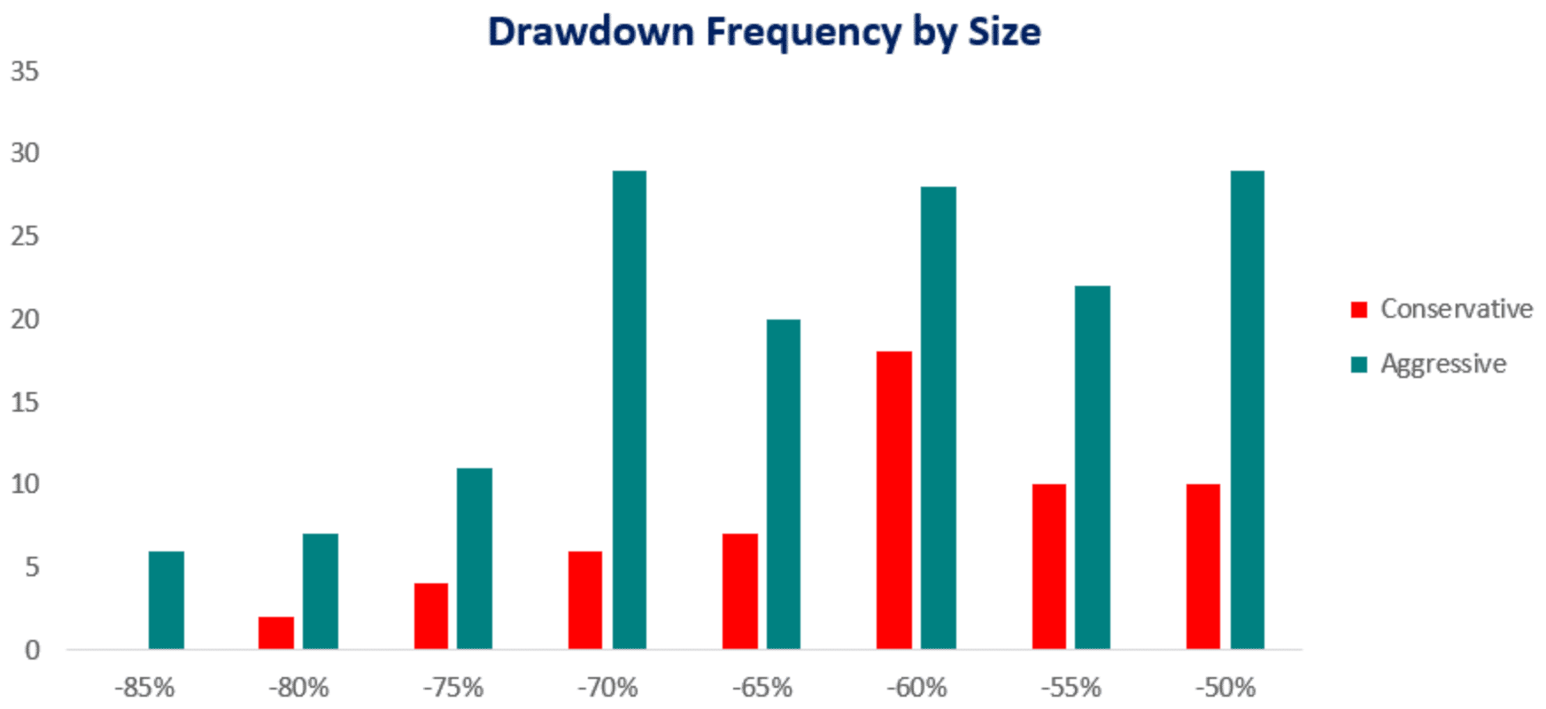 Следующая гистограмма показывает, что за высокую доходность приходится платить нестабильностью портфеля. Например, просадка на 70% происходила почти 30 раз при высокорисковой стратегии и всего 5 раз при консервативном подходе.