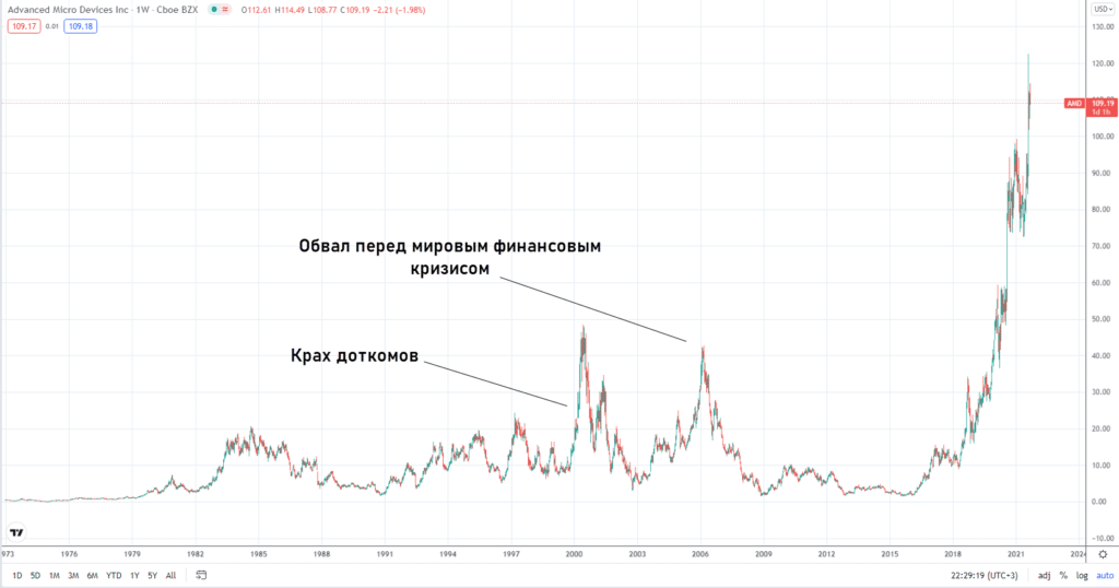 Несмотря на статус одного из крупнейших производителей микроэлектроники на истории нет явного долгосрочного бычьего тренда. Акции AMD периодически растут в цене, но для них характерны периоды затяжной стагнации.