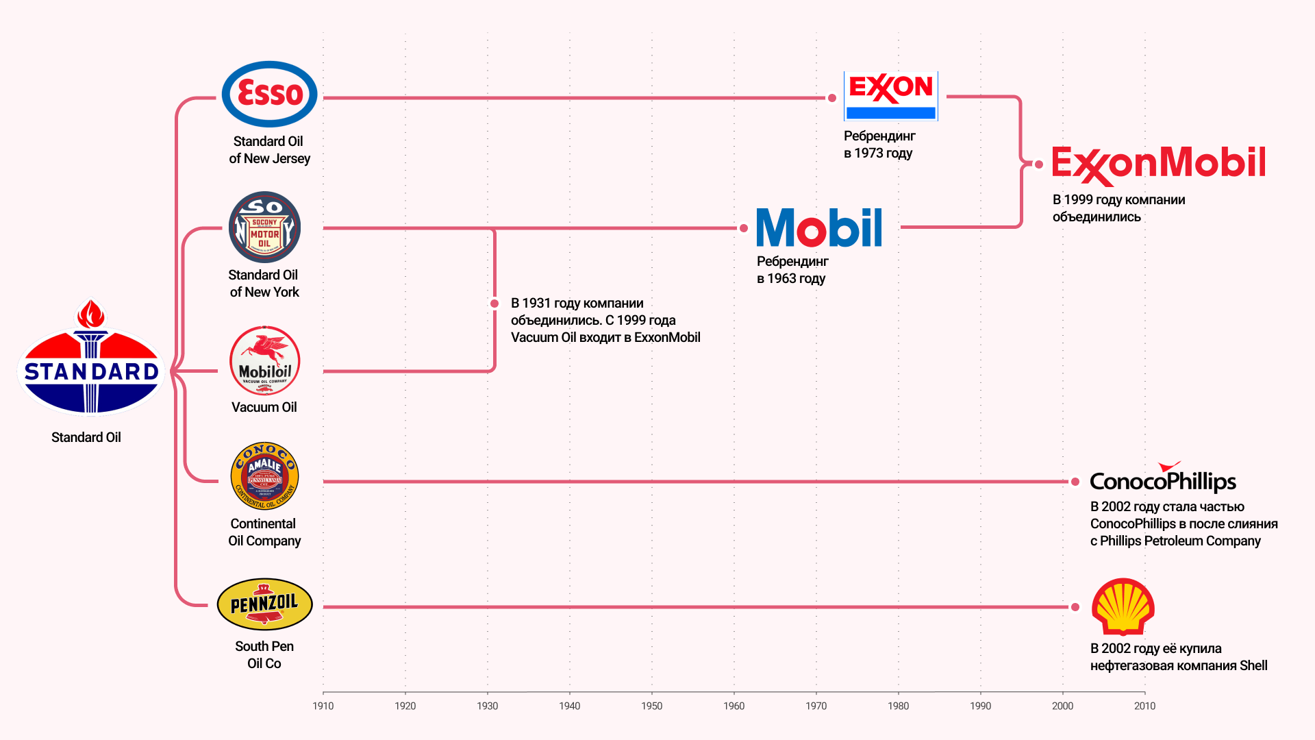 - В 1902 г. Каллинан совместно с партнером создает Texas Company, практически сразу в нее вливается техасская топливная компания. В том же году Standard Oil вводит в строй крупный НПЗ. Рокфеллер доминировал на нефтяном рынке. Трест Standard Oil контролировал большую часть рынка, дело дошло до суда, и трест был признан монополистом. Стандарт Ойл принудительно раздроблен на 34 отдельные компании, одной из них была Standard Oil California, так она получила независимость.