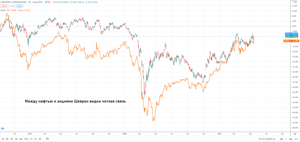 Компания Chevron Corporation входит в десятку крупнейших нефтегазовых компаний мира. Добыча ведется по всему миру, деятельность Шеврон не ограничена американскими месторождениями. Несмотря на то, что развитые страны декларируют переход на «зеленую» энергетику мир все еще нуждается в нефти и газе, поэтому в ближайшие десятилетия нефтяным компаниям ничто не грозит. Акции Chevron – это неплохой инвестиционный инструмент, за счет высокой корреляции со стоимостью «черного золота» на них можно неплохо заработать на короткой дистанции.