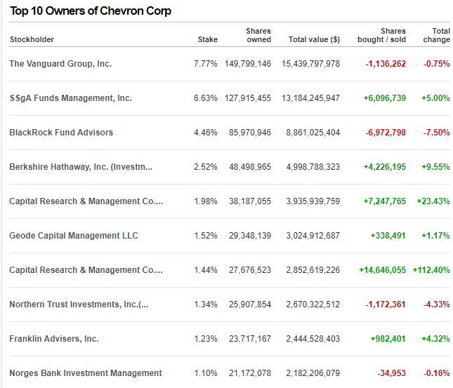 Характеристика акций Chevron Corporation, информация об акционерах