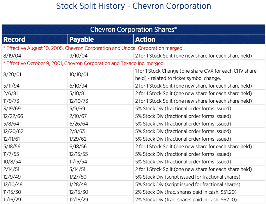 За время существования компании проводился ряд сплитов. Акции Chevron дробились для снижения стоимости одной ценной бумаги, за счет этого количество акций росло со временем. Сплиты проводились в формате выплаты дивидендов, то есть акционеры получали определенное количество ценных бумаг в зависимости от того какой долей акций владели. Первые сплиты по такой схеме проводились в 1929 и 1930 гг.