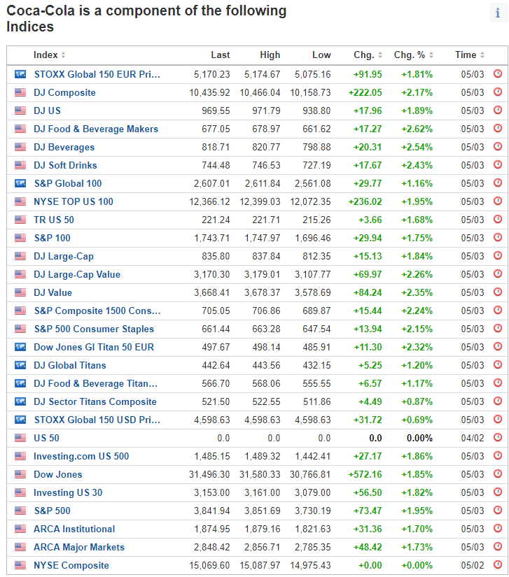 Стоимость акций Coca Cola влияет на котировки крупнейших фондовых индексов мира. Бумаги включены в состав S&P 500, S&P 100, S&P Global 100, DJ Sector Titans Composite и других индексов.