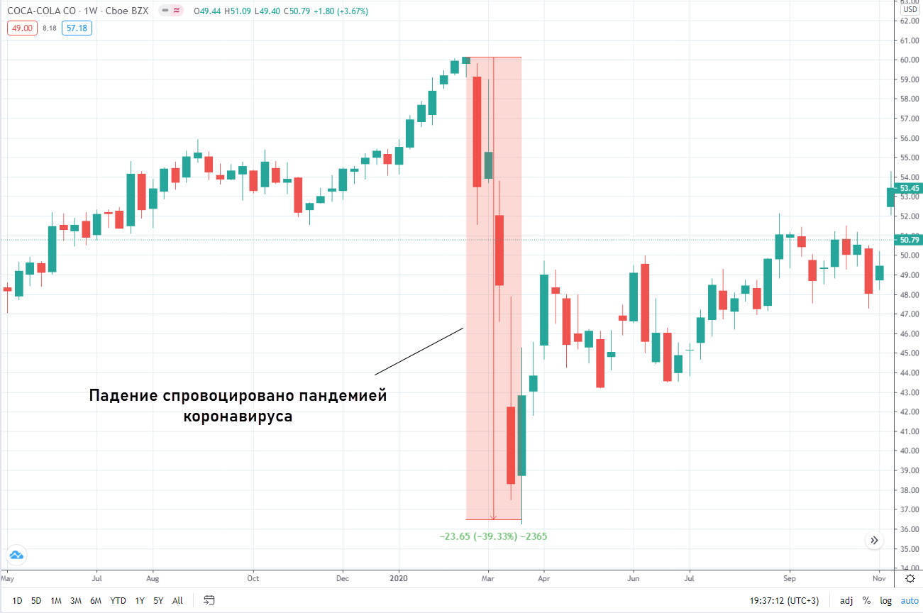 - Состояние мировой экономики. Во время пандемии бумаги Кока-Кола обвалились из-за того, что возникли опасения с перебоями поставок. К тому же напиток не входит в перечень жизненно необходимых товаров, при ухудшении уровня жизни продажи падают.