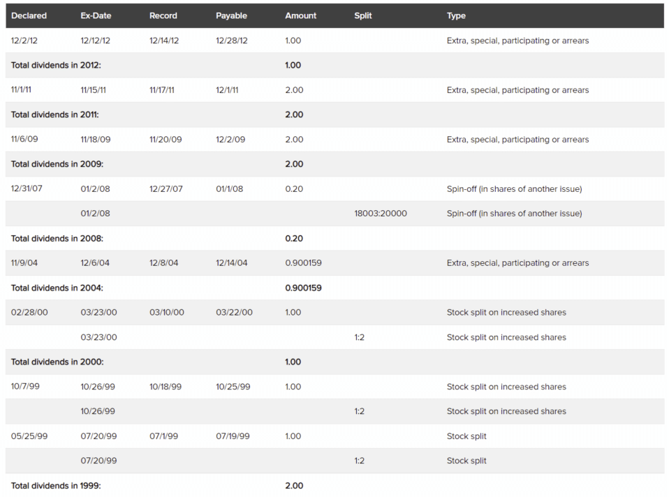 В прошлом проводилось 3 сплита, использовалась пропорция 1 к 2, то есть за 1 старую акцию давали 2 новые. Дробление ценных бумаг происходило 20 июля 1999 г., 26 октября 1999 г. и 23 марта 2000 г. На тот момент надувался пузырь доткомов, котировки сильно росли и сплиты проводились для облегчения привлечения новых акционеров.
