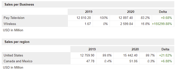 DISH Network Corporation остается одним из крупнейших провайдеров спутникового интернета в США. Позиции компании устойчивы, но нет стабильного роста, текущее положение дел можно охарактеризовать как стагнацию. В конце десятых годов произошли существенные перемены в бизнес-модели, помимо спутникового ТВ в портфеле Диш появилась беспроводная связь. Всего за год в структуре продаж доля этого направления выросла с долей процента до 16-17%.