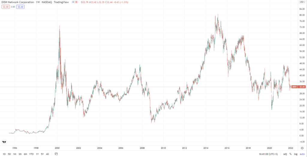 IPO прошло в 1995 г. (имеется в виду компания EchoStar, чьим подразделением в то время и была DISH), за следующие 5 лет котировки бумаг взлетели, в моменте достигая отметки $73,00 за акцию. Крах доткомов сильно сказался на стоимости акций, исторический максимум был обновлен лишь осенью 2014 г. Акции DISH как самостоятельной компании стали доступны на биржах лишь в 2008 г. после разделения EchoStar на 2 отдельных бизнеса.