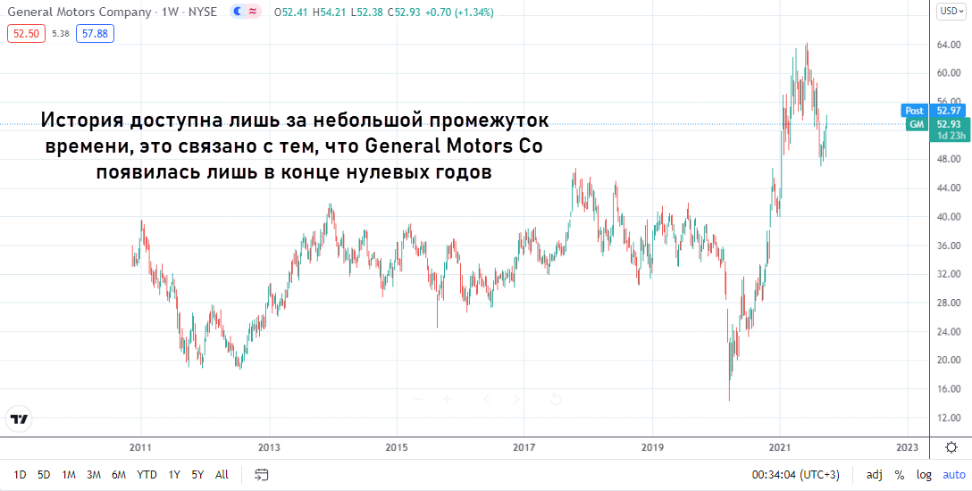 Бренд General Motors – один из старейших на планете, но история акций General Motors Company доступна лишь за небольшой промежуток времени. Это связано с тем, что General Motors Co появилась лишь в 2009 г. в результате отделения от General Motors Corporation. В этот год корпорация запустила процедуру банкротства.