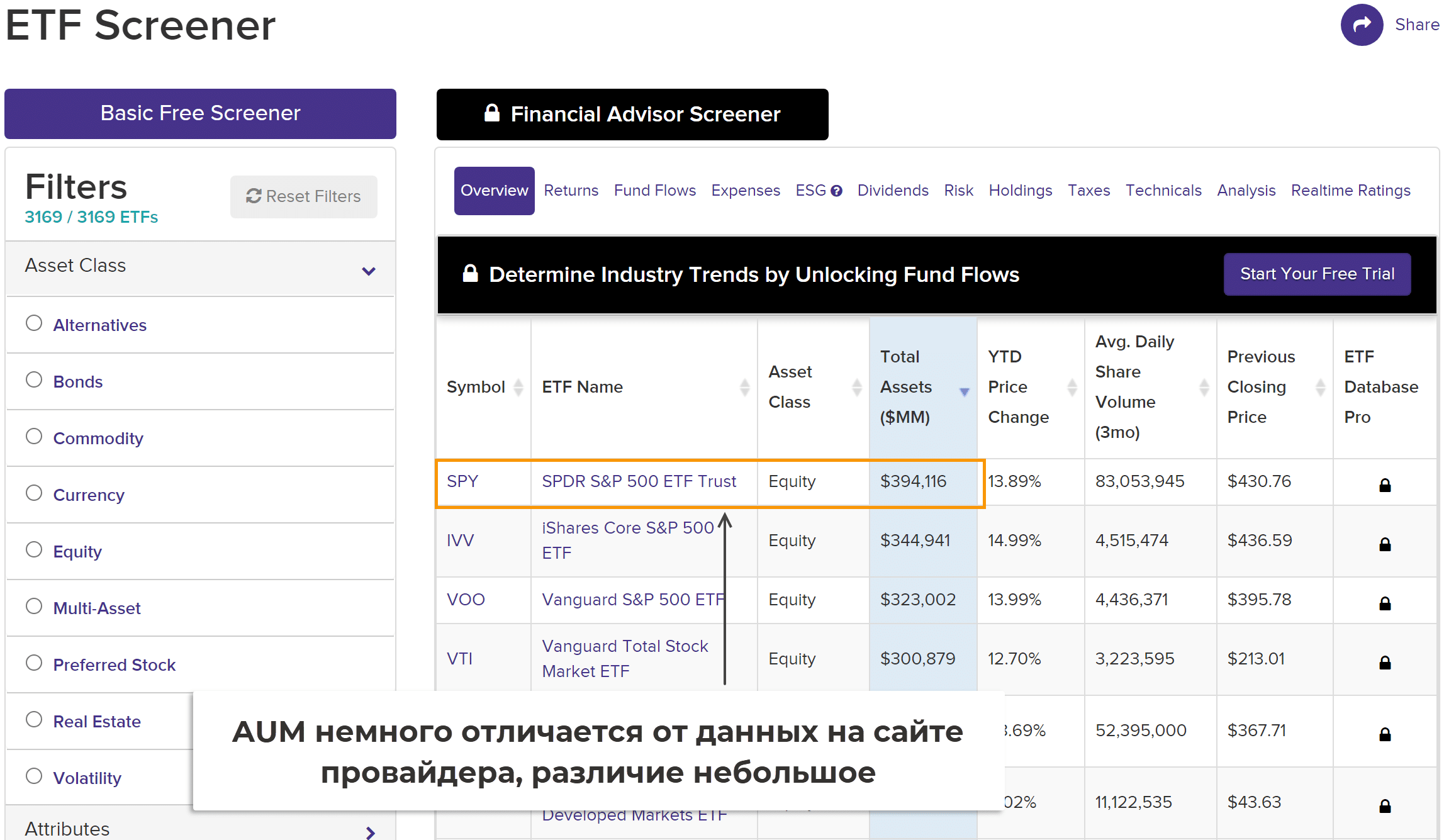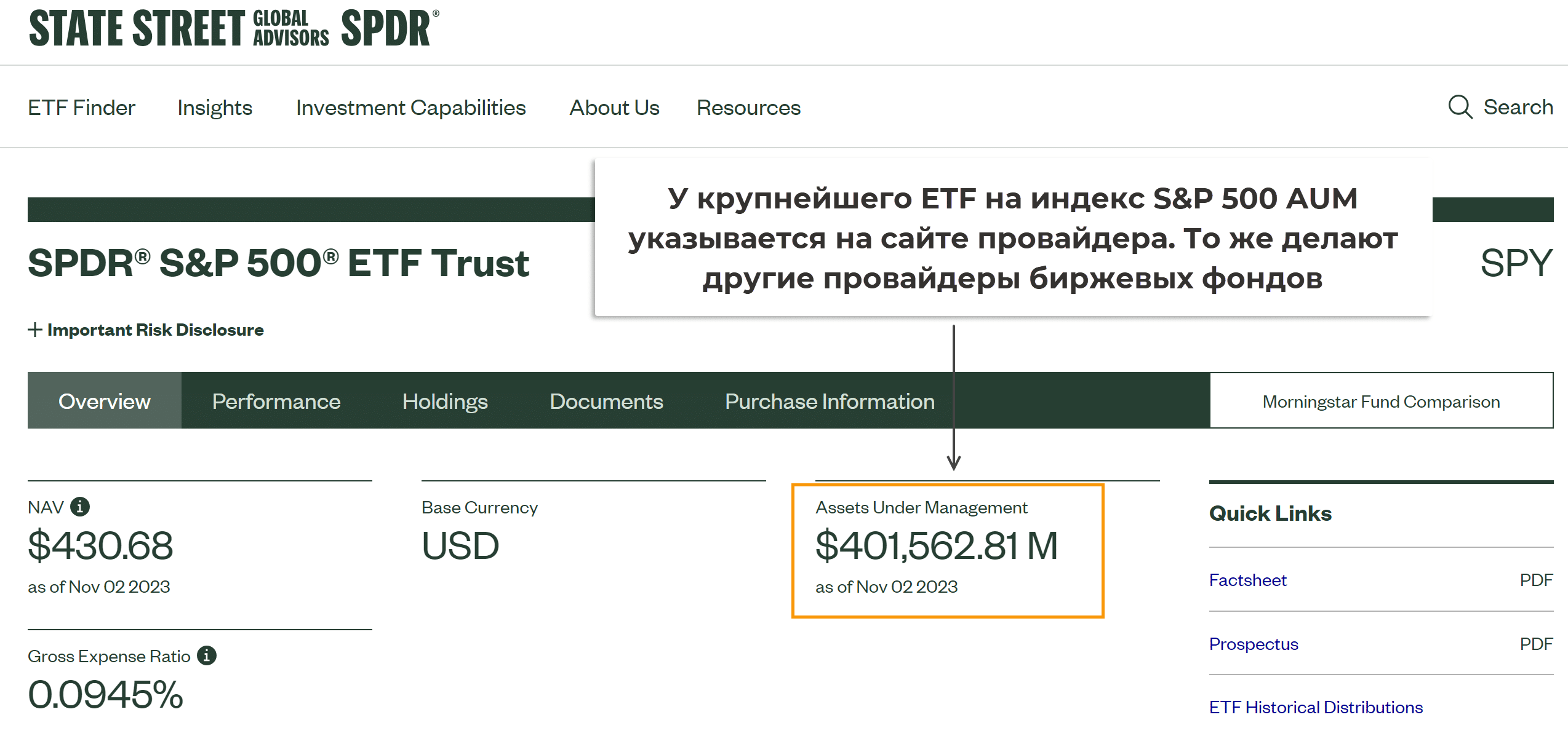 Из-за разной частоты обновления информации данные на сайте провайдера и у сторонних сервисов могут отличаться. Но различия небольшие, на общую картину не влияют. В примере на сайте провайдера ETF с тикером SPY AUM составляет $401,5 млрд, а на etfdb.com – $394,11. Разница есть, но она скорее косметическая.