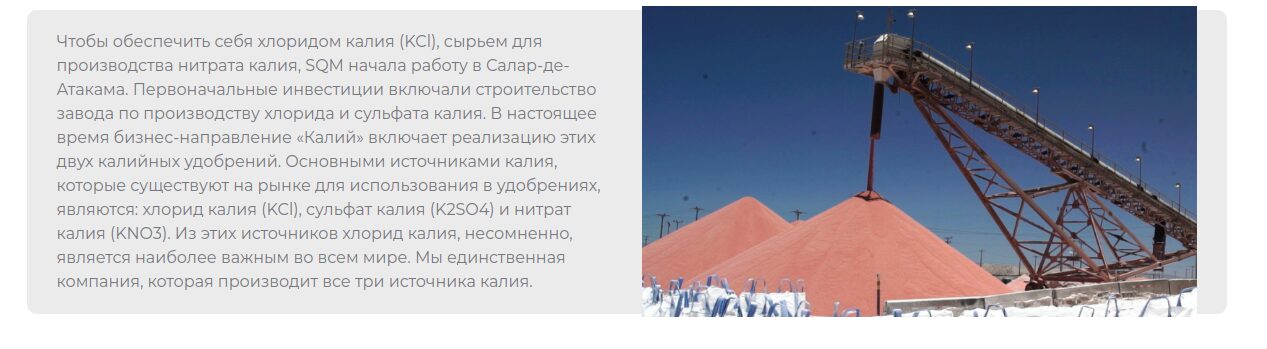 - Калий и его производные: Включают добычу и продажу хлорида калия (является побочным продуктом производства лития). Основное применение хлорида калия — как стабилизатор для бурения нефтяных скважин. Кроме того, компания производит нитрат калия для использования в качестве удобрения или компонента теплоносителя в солнечных тепловых электростанциях.