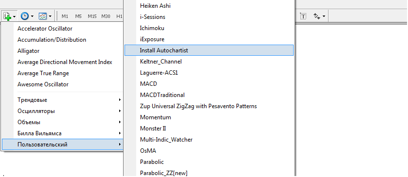 - Для того, чтобы воспользоваться бесплатным вариантом, просто открываем установщик авточартист Альпари в самом терминале. Он находится в списке индикаторов, раздел – “Пользовательские”. Ищем название Install Autochartist, нажимаем.
