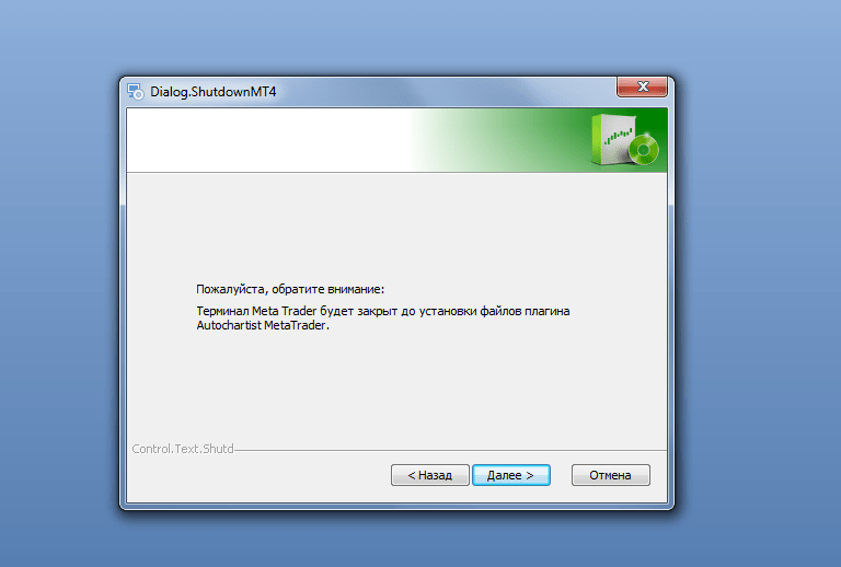 Следом выскакивает предупреждение, что терминал будет закрыт на время установки. То есть, если есть какие-то открытые сделки, требующие постоянного наблюдения, то лучше отложить установку, либо закрыть эти сделки.