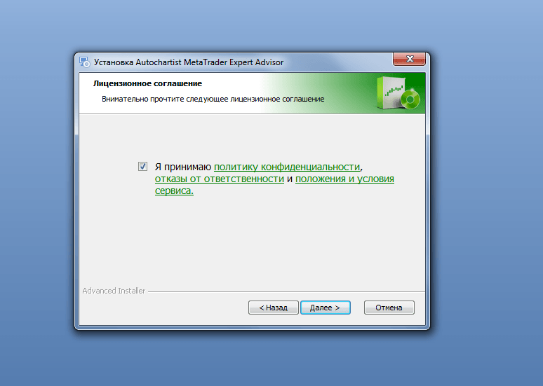 Нажимаем “Далее” и ставим галочку на пользовательском соглашении. Кратко суть его состоит в том, что компания не несёт ответственности. Например, в случае, если трейдер зайдёт в сделку на весь депозит с плечом 1:1000 по сигналу на дневном тайм фрейме.