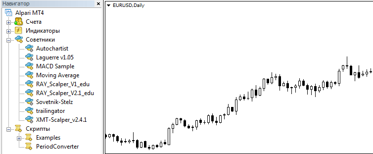 Далее открываем торговый терминал и заходим в “Навигатор”. Авточартист Альпари должен появиться в списке советников. Если по какой-то причине его там нет, нужно попробовать переустановить плагин, повторив все выше описанные действия. Если и это не поможет, то нужно обращаться в техподдержку. Но обычно всё получается и советник присутствует в списке. Итак, чтобы запустить Autochartist для metatrader 4, кликаем по нему дважды. Должно появиться стандартное для советников окошко, которое служит для настройки: