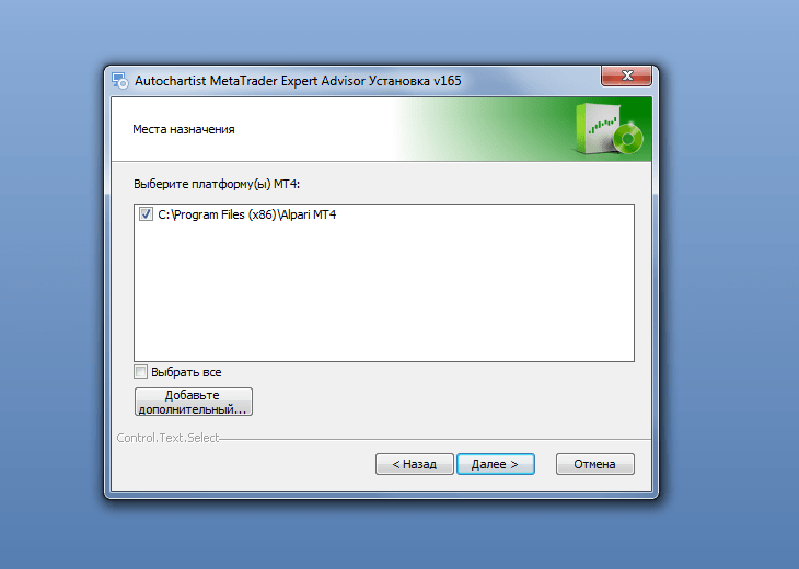 После того, как согласие дано, открывается окошко, где выбираем торговый терминал, в котором будет использоваться Autochartist. Например, если есть метатрейдеры не только Альпари, но и другие, то они тоже появятся в этом окошке. Ставим галочку на терминал Альпари. ВАЖНО: с другими терминалами, не от этого брокера и не входящими в список брокеров, сотрудничающих с Autochartist, плагин работать не будет.