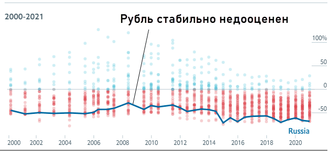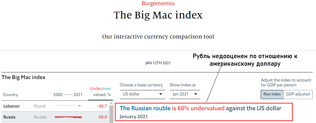 Для наглядности сравним RUB и USD. The Economist сообщает, что в соответствии с индексом российская нацвалюта недооценена на 68%.