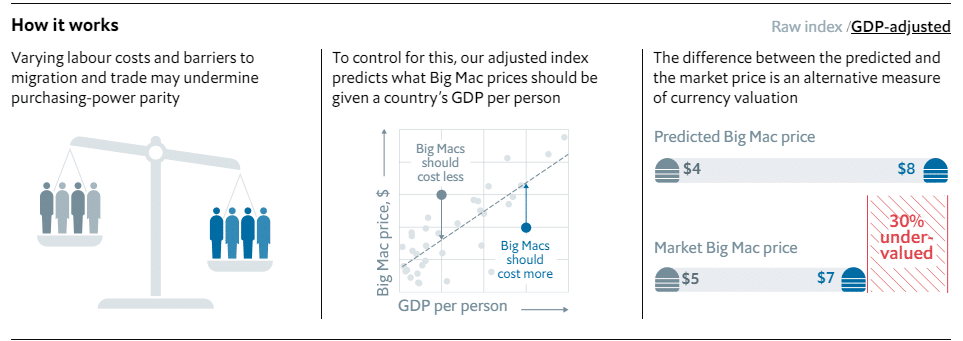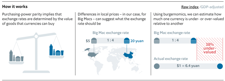Если не вдаваться в детали, то конечное значение индекса получается как результат деления стоимости бургера в локальной валюте к стоимости в долларах. Затем число сравнивается с текущим биржевым курсом местной валюты к доллару и делается вывод о ее переоцененности или недооцененности.