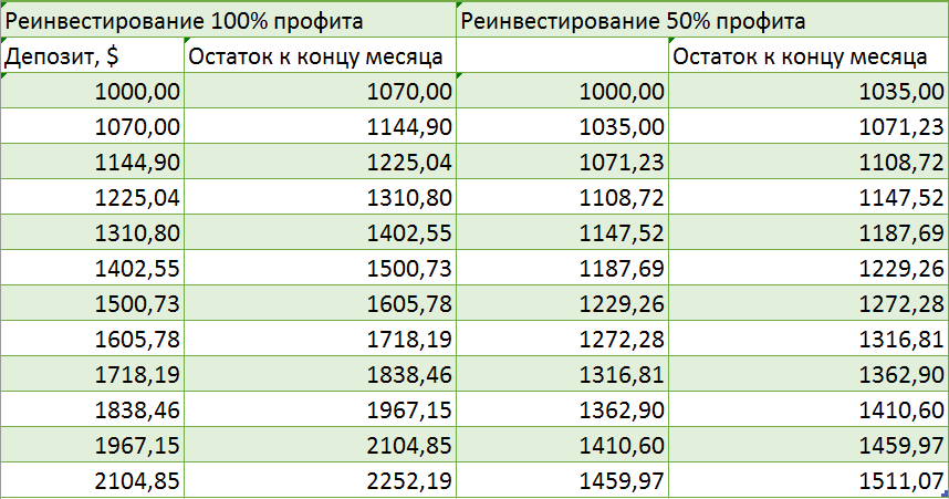 - частично реинвестировать профит и наращивать стартовый капитал;