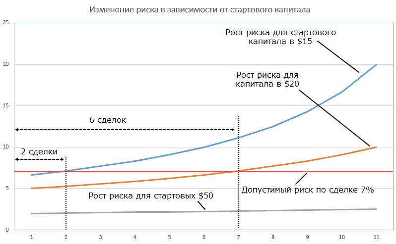 - При повышении капитала до $20 максимальная серия убыточных сделок до превышения 7%-ного барьера повышается уже до 6;