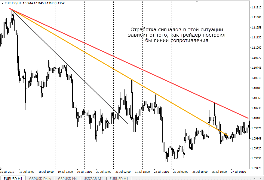 - Графический анализ. Сюда относим торговлю с использованием горизонтальных уровней, коррекционных уровней Фибоначчи, трендовых линий, графических паттернов. Требует навыков разметки графика. Из недостатков отметим разве что долю субъективизма при построениях. Например, положение трендовой линии зависит от того, какие именно локальные максимумы и минимумы выберете. В итоге разметка разных трейдеров может не совпадать, а это влияет на эффективность торговли;