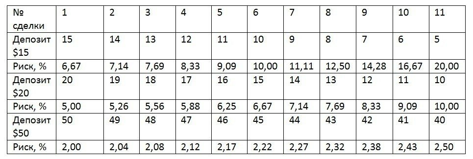 Пример. Предположим, в вашей ТС принят риск не более 7% депозита по сделке, Вы начинаете работать с минимальной ставкой (примем ее равной $1), теперь рассчитаем, как меняется риск при серии неудачных сделок для разных депозитов.
