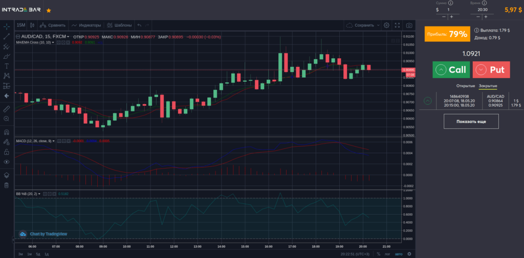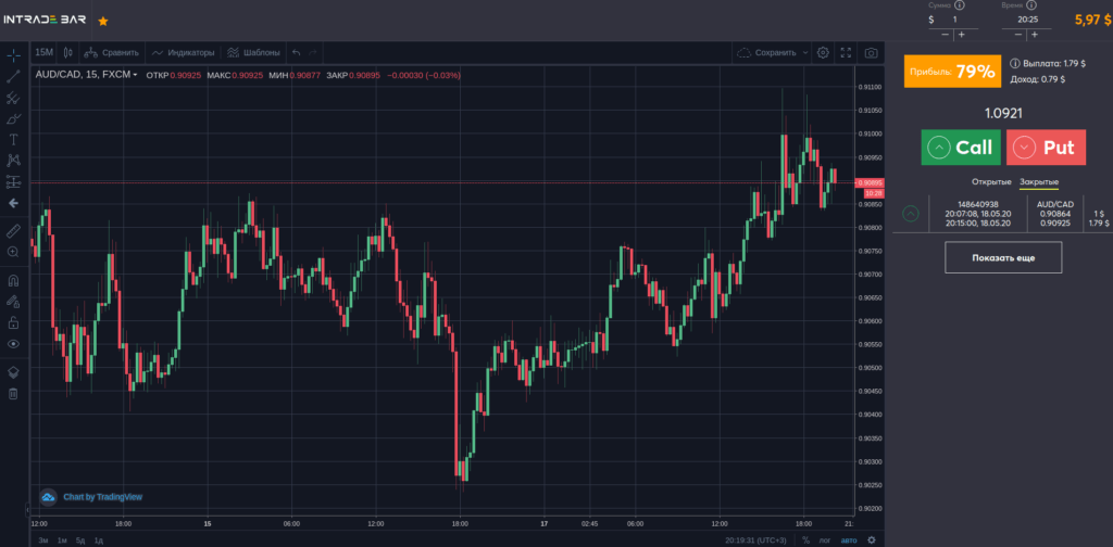 - Какая платформа используется, удобно ли с ней работать. Обычно брокеры предлагают что-то простое, а если нужен детальный анализ графика, трейдеры пользуются МетаТрейдером или живым графиком от TradingView. Ниже – пример веб терминала одного из лучших брокеров Intrade Bar.