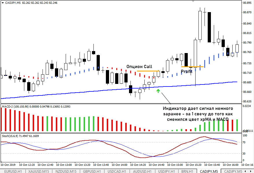 Если в The Sag мувингам выделялась основная роль, то в этой торговой системе используется набор индикаторов. Скользящие средние используются для фильтрации сигналов. Стратегия изначально разрабатывалась для форекса, но впоследствии неплохо себя показала на рынке бинарных опционов.