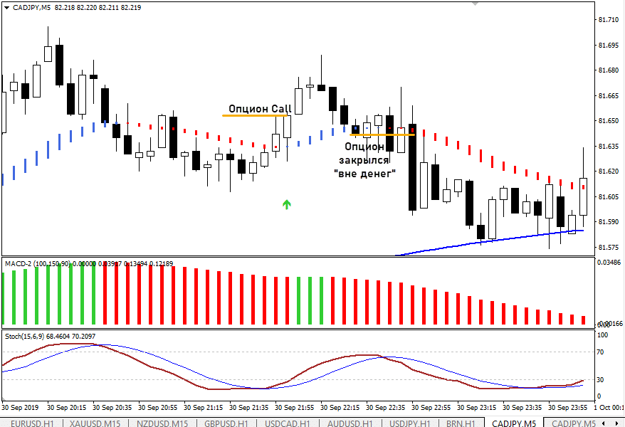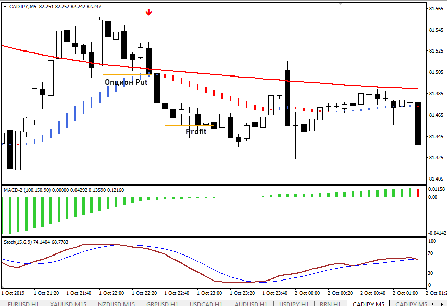 - Стохастик в это время находится ниже уровня 20. По опционам Put условия меняем на противоположные.