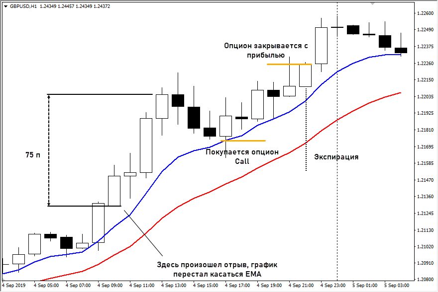 Изначально ТС адаптировалась только под торговлю на часовом графике GBPUSD. Из индикаторов используются только ЕМА8 и ЕМА18. Торговля ведется в направлении тренда, а опцион покупается на окончании отката.