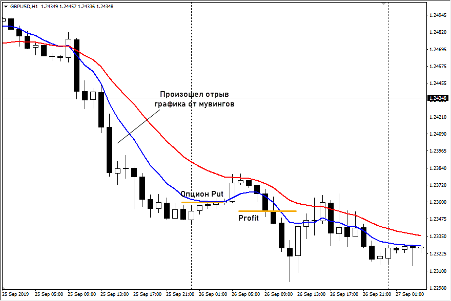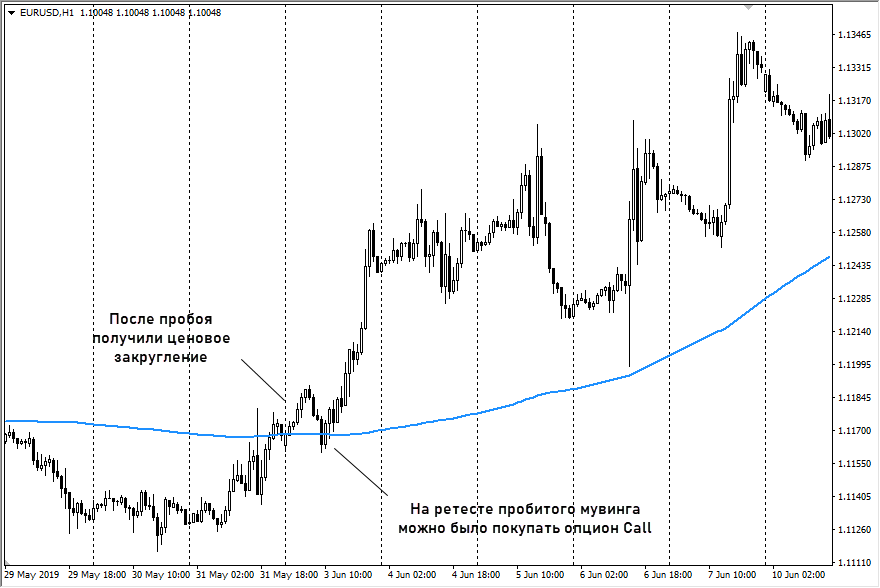 - пробой и ретест «тяжелого» мувинга. Тот же принцип, что и с обычными линиями поддержки, сопротивления. Ждем пробой и на возврате графика к линии мувинга покупается опцион из расчета, что движение продолжится в направлении пробоя;