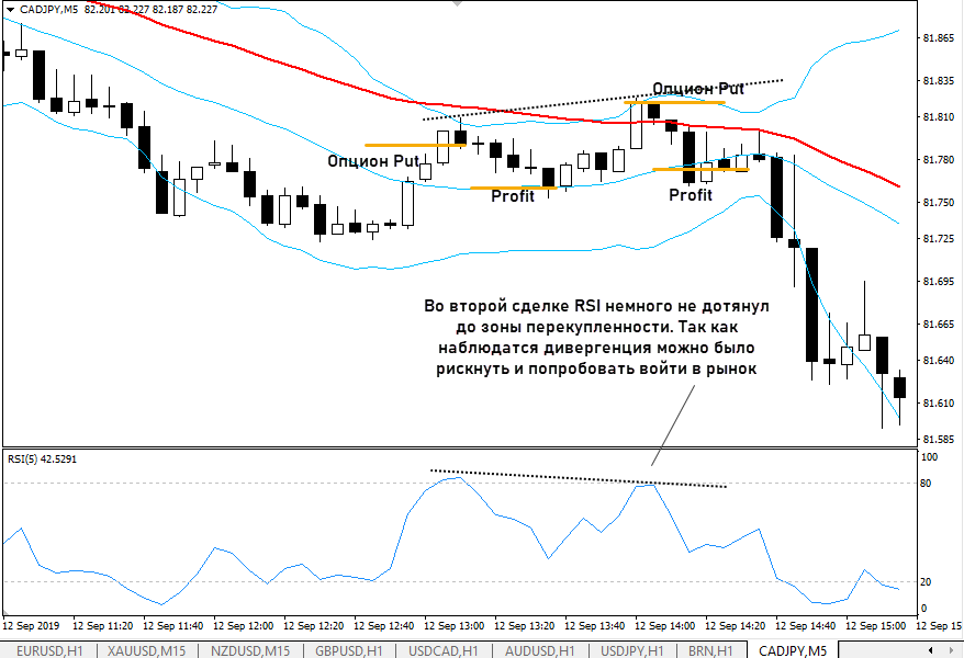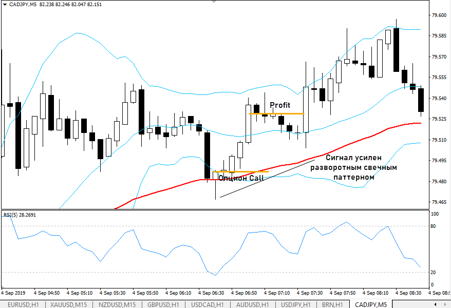 Опцион приобретается на касании ВВ. Срок экспирации – 5-7 свечей. Для опционов Call логика та же, только правила меняются зеркально, работаем уже с нижней границей ВВ.