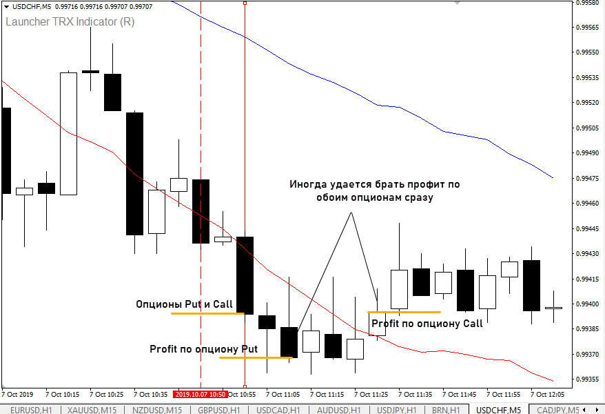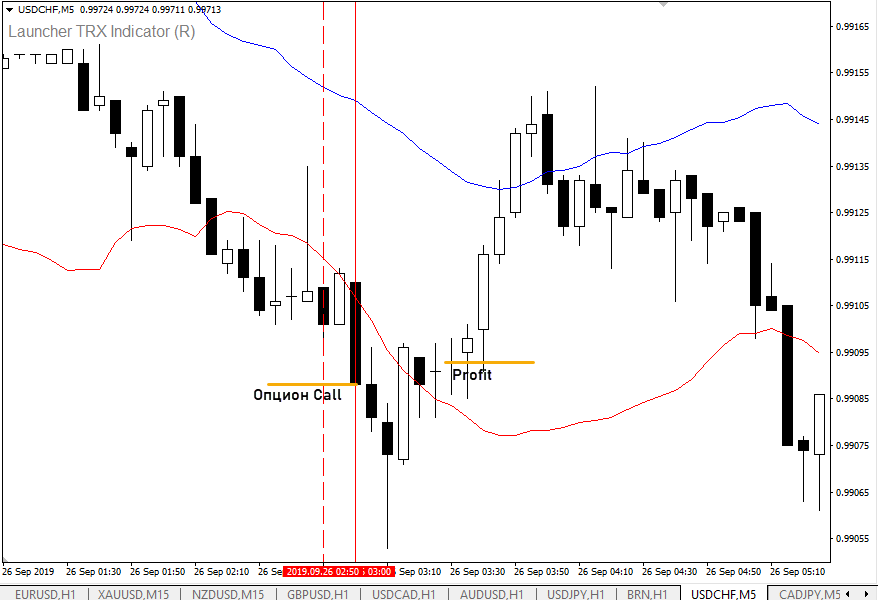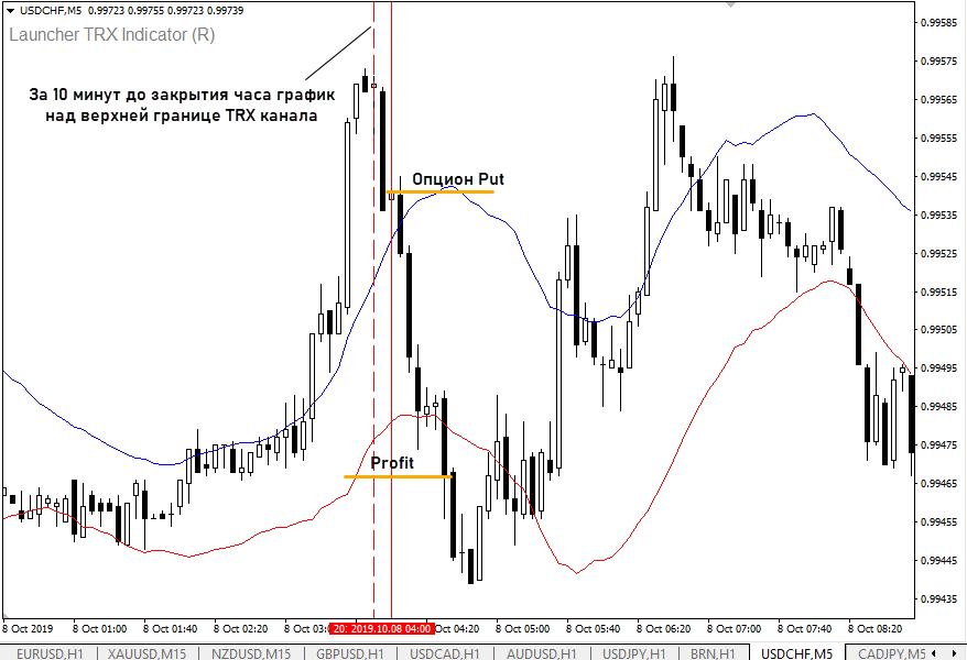 - за 10 минут до закрытия часовой свечи оцениваем положение графика относительно TRX канала. Если график над верхней границей, работаем с Put опционами, если под нижней – с Call;