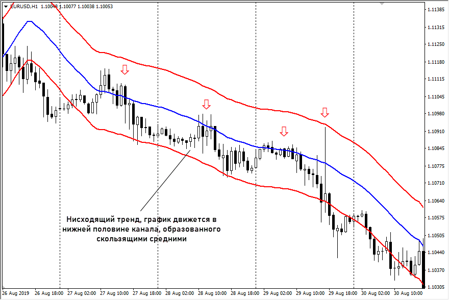 - канал из скользящих средних. Линию можно сместить на N пунктов вверх и вниз, получим канал. Причем этот канал будет динамическим, положения его границ меняются в зависимости от движения графика. Этот прием подходит и для состояния флета, и для трендовых участков. Если торгуете бинарными опционами, против тренда лучше не работать.