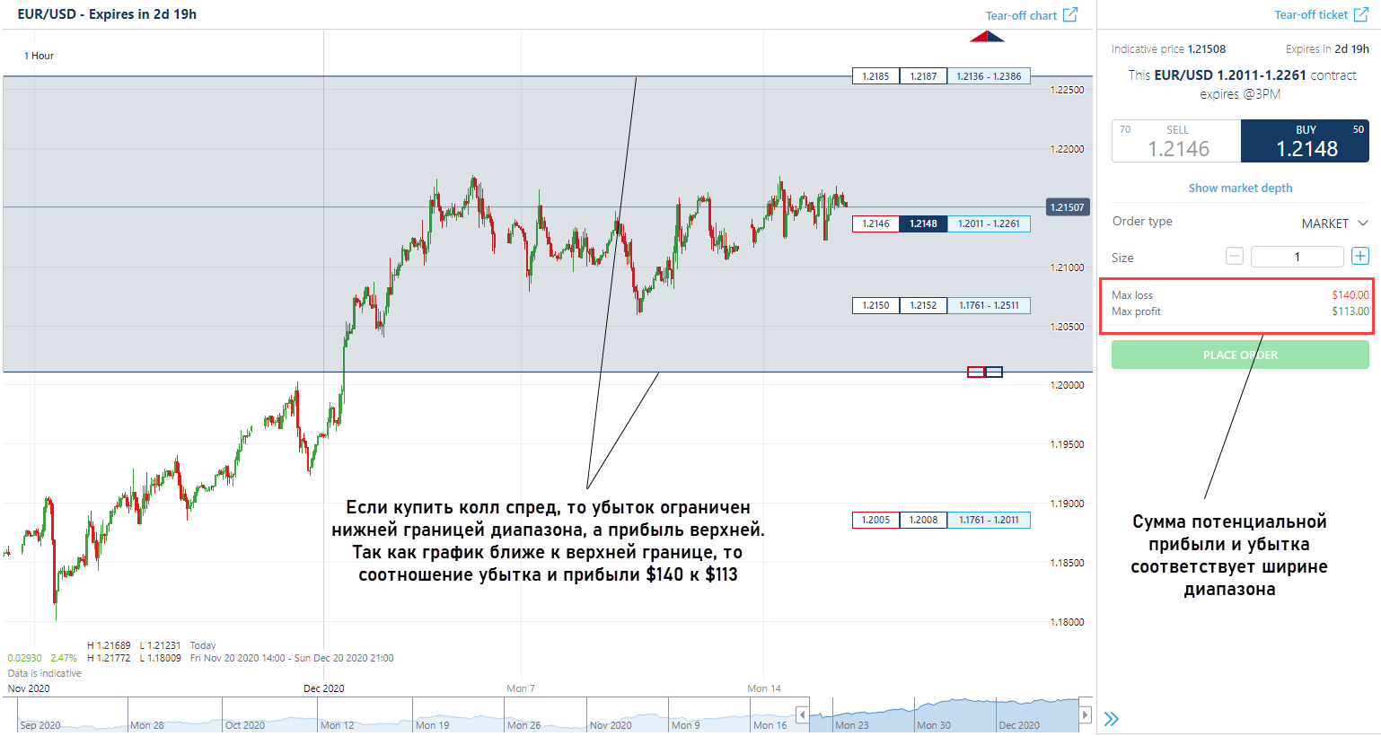 Call Spread контракты выделяются тем, что по ним задается «пол» и «потолок». Верхняя и нижняя границы, выступающие ограничителями убытка и профита по сделке.
