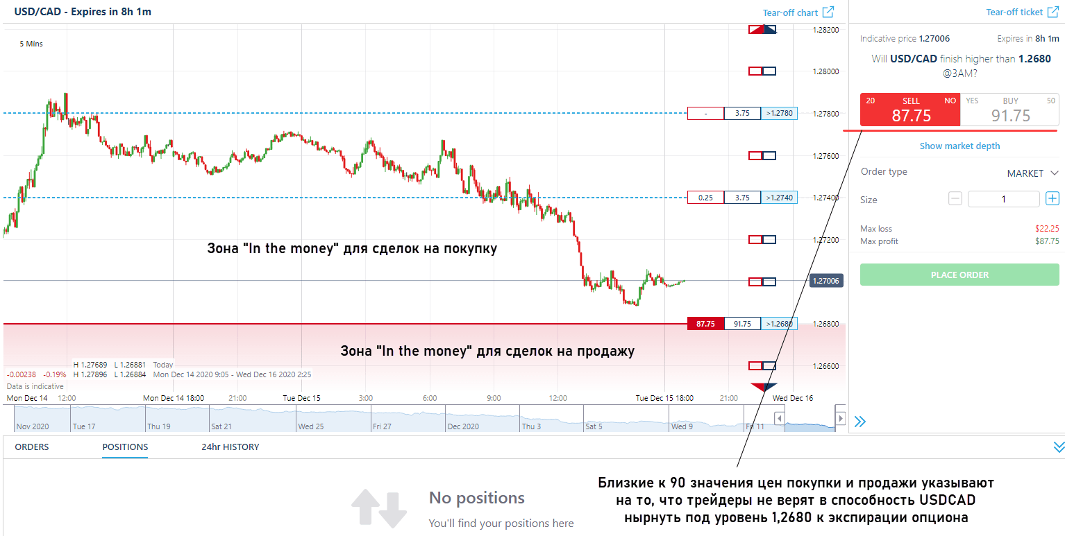 - Можно продать контракт по $87,75 или купить его по $91,75. Можно рассчитать вероятность того, что график останется над 1,2680. Для этого рассчитываем среднее между Бидом и Аском, вероятность того, что пара USDCAD не опустится под 1,2680 составляет 89,75%.