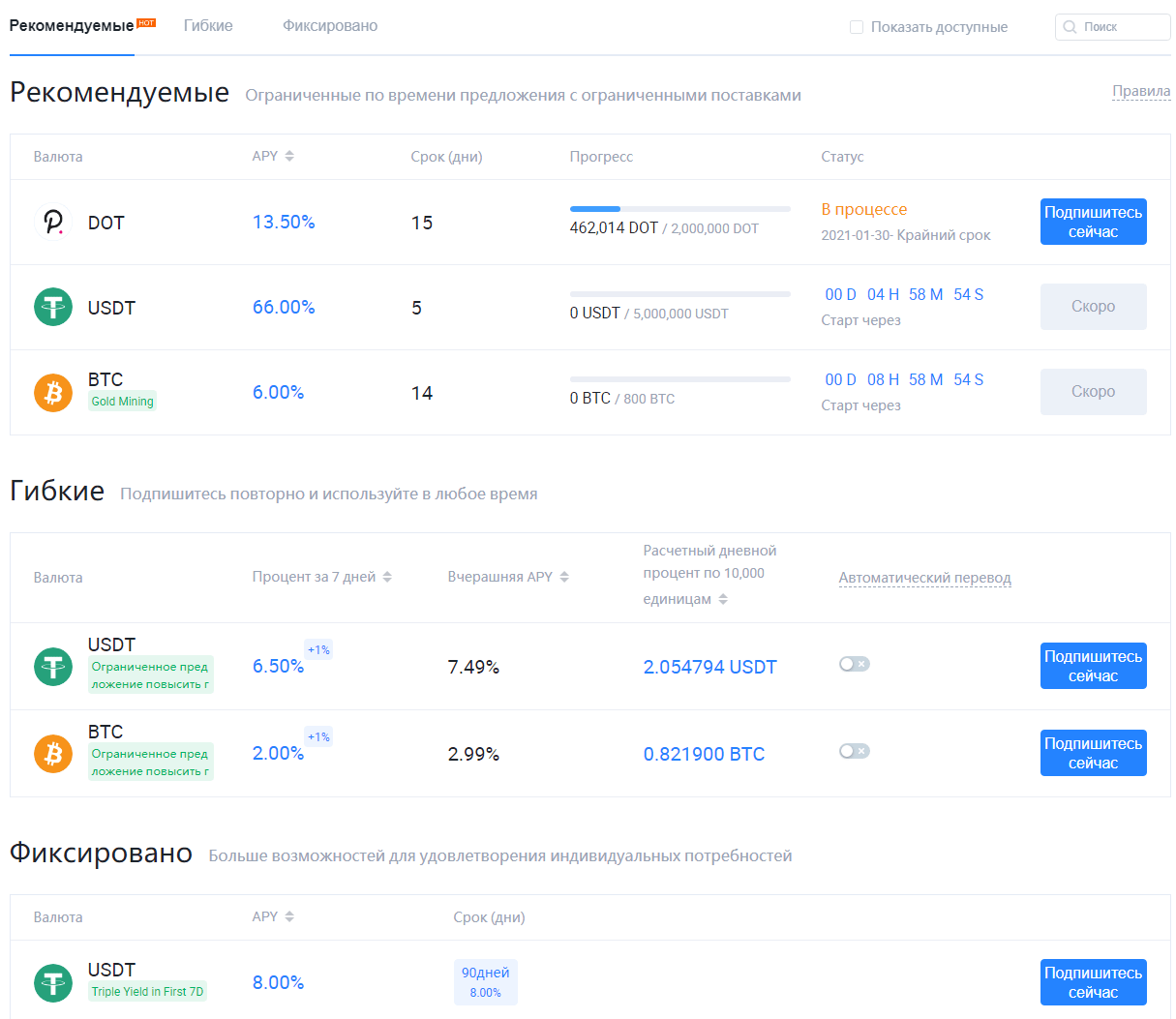 Например, фиксированная подписка в USDT принесет 8% от инвестиций за 90 дней. Для фиксированных планов предлагается повышенная доходность так как инвестор не будет иметь доступа к активам до истечения срока действия подписки.