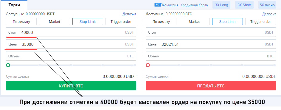 - Stop Limit. Этот тип можно назвать более гибким вариантом отложенных ордеров. При задании параметров сделки есть 2 цены – Стоп и Цена. При достижении стопового уровня на отметке Цена выставляется обычный лимитник. Преимущества этого типа ордеров удобнее рассмотреть на примере. При курсе BTCUSDT равным 32100 выставляется ордер на покупку Stop Limit со стоповой ценой 40000 и ценой входа в рынок 41000. Это значит, что при росте курса BTCUSDT до 40000 автоматически будет размещен ордер на покупку по цене 41000. Инструмент более гибкий по сравнению с обычными лимитными приказами. Биржа HTX вводит ограничения на расстояние между стоповой и лимитной ценами. При покупках лимитная цена не должна превышать 110% от стоповой, при продажах – 90% от нее.
