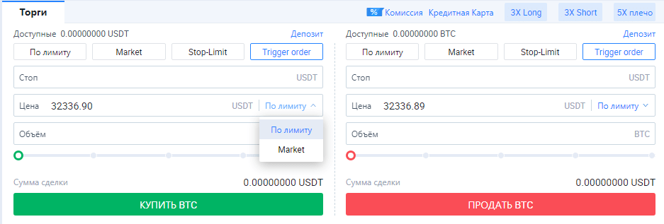 - Под окном с графиком находится кнопка «Комиссия», об особенностях комиссионных сборов поговорим ниже и ссылка для покупки крипты за фиатную валюту непосредственно с банковской карты. Рядом – кнопки для ETP торговли, этот инструмент также разберем отдельно. Ниже – окна, в которых выбирается тип ордера и параметры сделки.