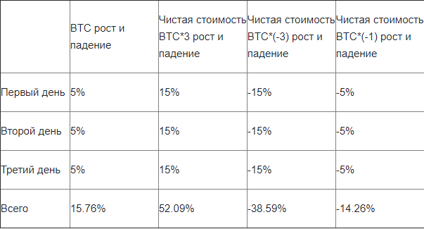 В отличие от маржинальной торговли по ЕТР нет заемных токенов и платы за использование займа, также биржа не ликвидирует позиции принудительно, как это происходит при маржинальном трейдинге. Но повышенная волатильность – это не только преимущество, но и слабая сторона ЕТР – при движении в убыточном направлении убыток будет нарастать быстрее по сравнению с обычной спотовой торговлей. Например, при росте ВТС в среднем на 5% в день по ЕТР прибыль/убыток будет нарастать гораздо быстрее, в таблице ниже приведены соответствующие расчеты.
