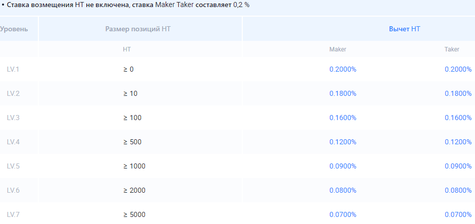 Для обычных пользователей при объеме позиций в HT (токены HTX) свыше 5000 комиссия понижается до 0,07%. Применяется вычет в токенах НТ.