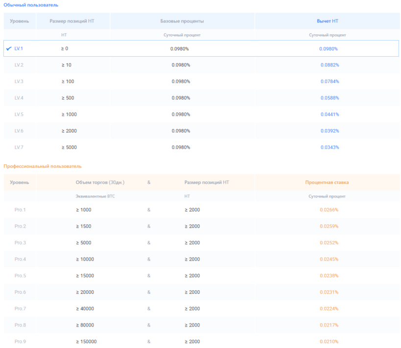 Маржинальный процент (стоимость займа) также зависит от уровня и типа пользователя. Для рядовых трейдеров первого уровня он доходит до 0,098% в сутки, вычет за счет HT не применяется. По мере увеличения размера позиций в токенах НТ снижается стоимость займа.